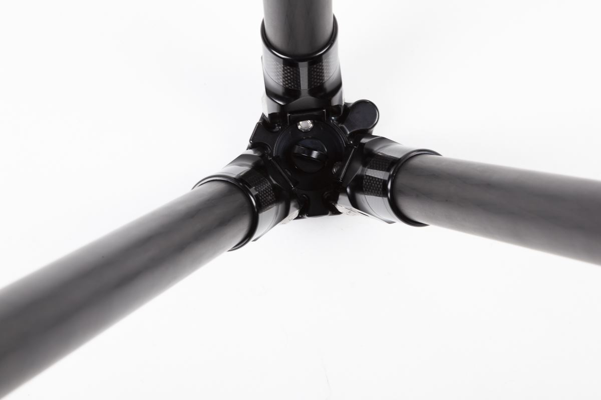 Die Beine des CP-30 M5 II (Hybrid) bestehen aus 5 Segmenten. Das Stativ kann daher trotz seiner Höhe von 150 cm, auf nur 46 cm Packmaß zusammengeschoben werden. Die Beine lassen sich bei diesem Modell nicht mehr nach oben wegklappen, wie dies bei den alten Modellen mit Mittelsäule möglich war. Zugunsten einer verbesserten und stabileren Mechanik für die Rastfunktion der Stativbeine in Zusammenhang mit einer neuen Schulter aus CNC-gefrästem Aluminium verzichteten wir auf diese Funktion. Ebenfalls CNC-gefräst werden nun die Aluminium-Beinanschlüsse. Dies erhöht zusätzlich die Festigkeit und Langlebigkeit der Mechanik gegenüber den früheren Stativ-Teilen aus Druckguss.