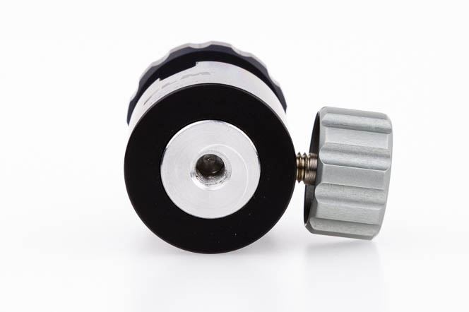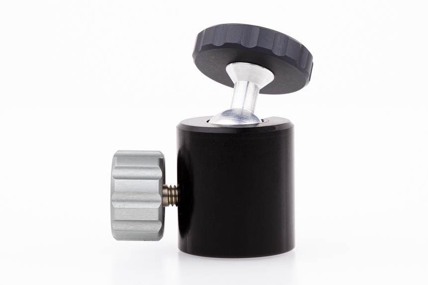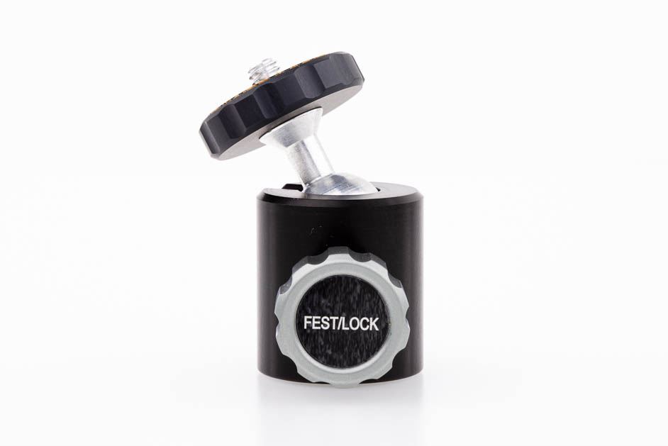 Kleiner Stativkopf inkl. Aufnahmeteller mit Gummi-/Korkauflage für universelle Anwendungsfälle, z.B. auf dem CP-10. Ohne Friktion. Klemmung einstellbar über Stellschraube mit eloxiertem Aluminiumgriff. Kugel mit 1/4 Zoll-Gewinde. Bodengewinde 1/4 Zoll. Gehäuse aus schwarz eloxiertem Aluminium. Kugel aus Aluminium, blank.