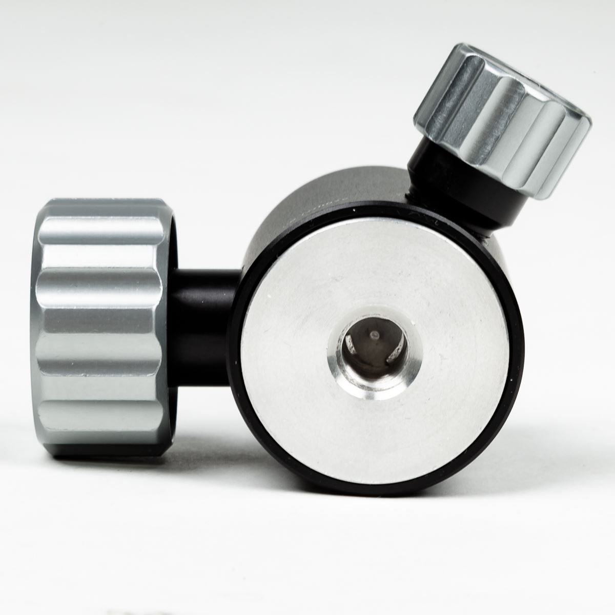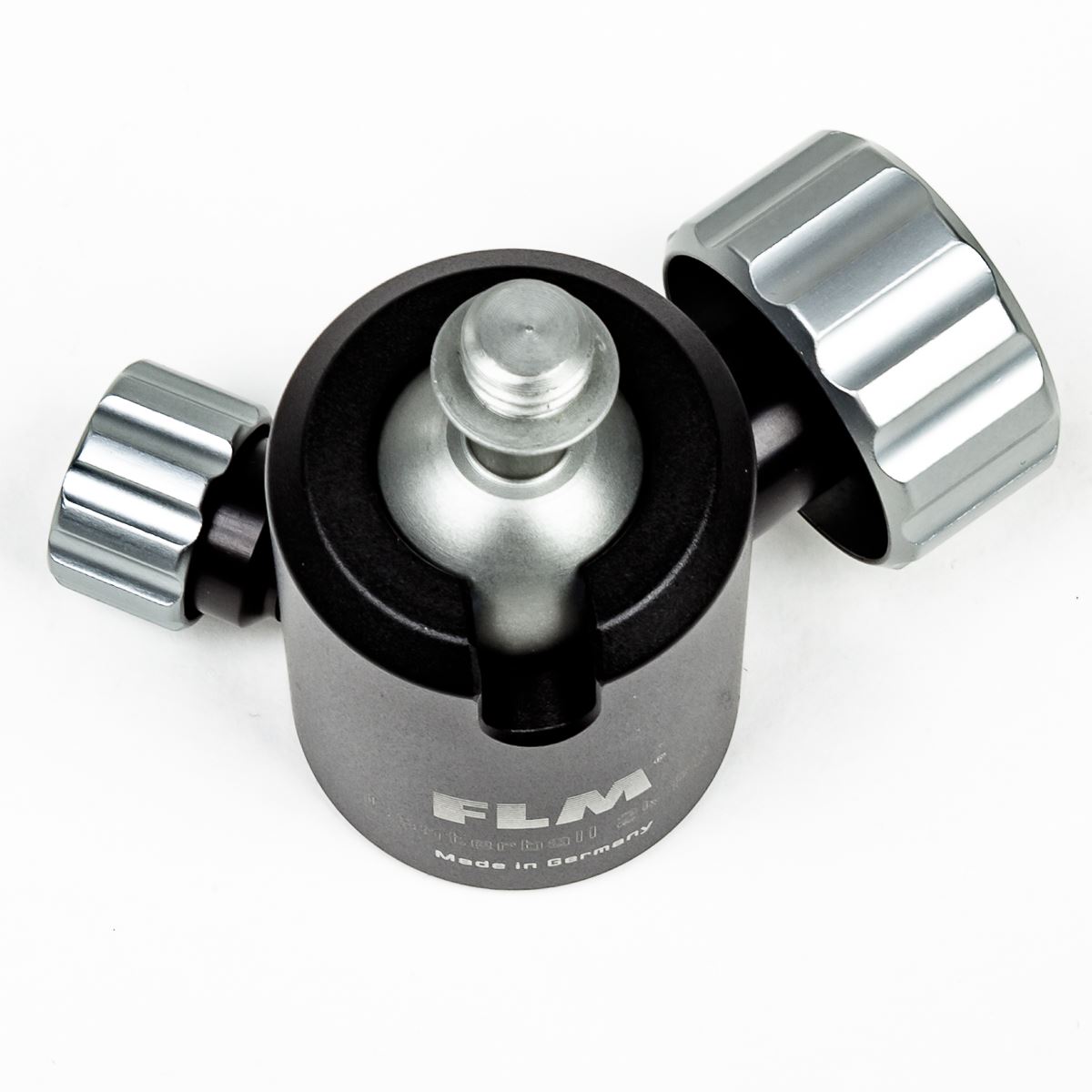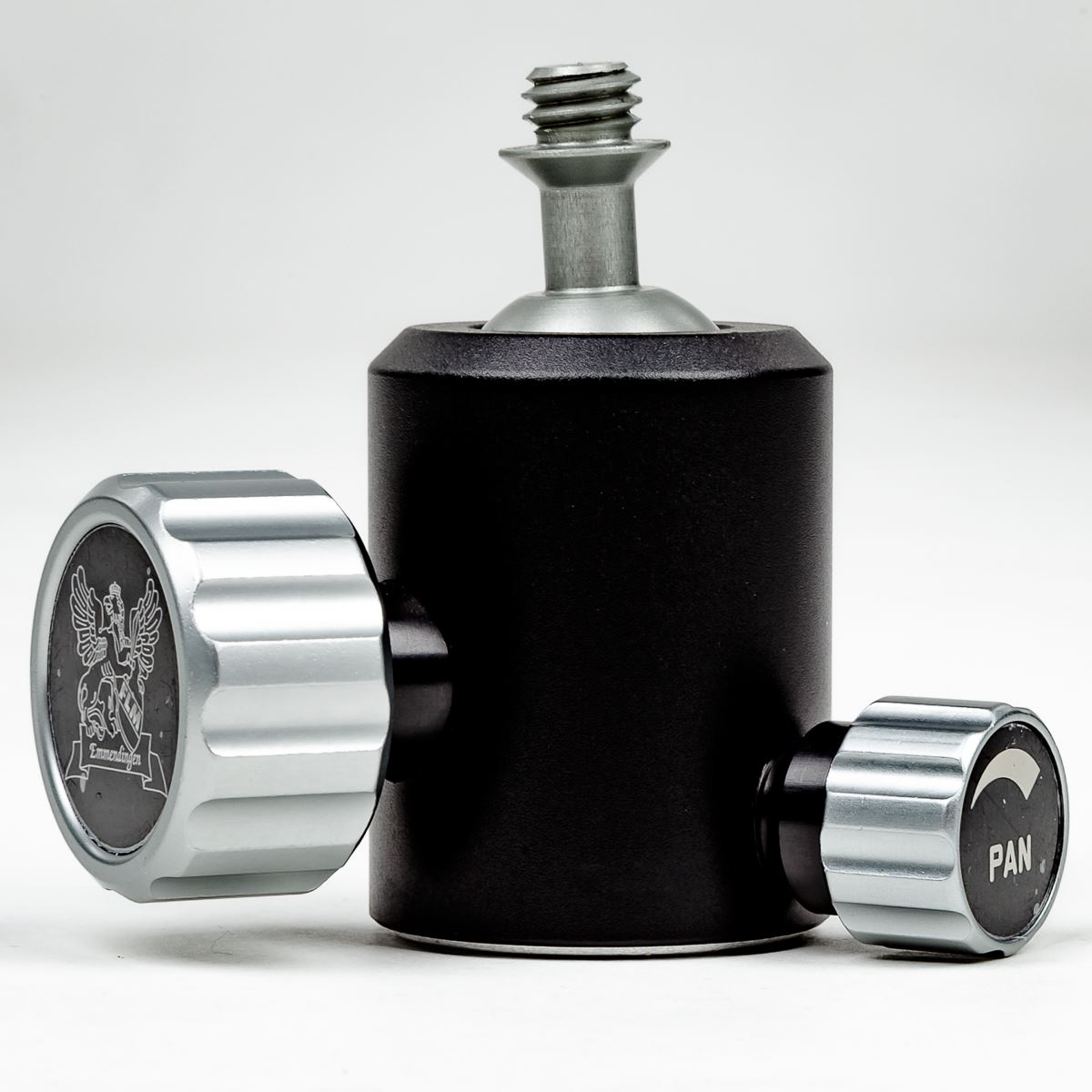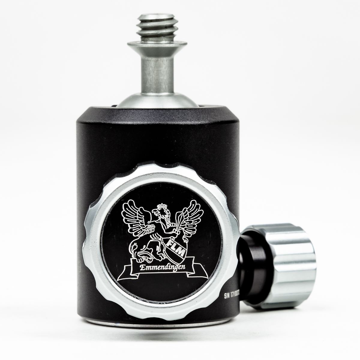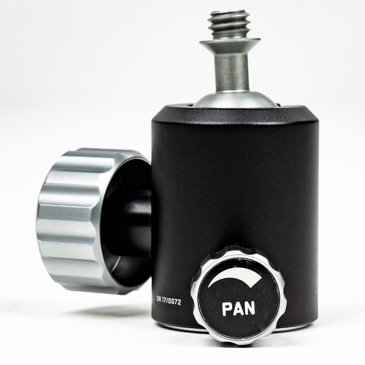 Einfacher Stativkopf mit separater Fixierung der Bodendrehung | Klemmung durch Messingring mittels Griffschraube | Klemmkraft für Drehung um Hochachse einstellbar | kurzes 3/8" Kugelgewinde von 5 mm Länge